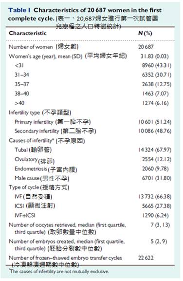 本篇研究統計2007年到2016年在上海第九人民醫院所有第一次進行試管嬰兒療程並使用全冷凍策略之婦女的活產率(共20,687個婦女),該婦女族群的人口特徵如表一,