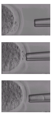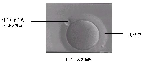 因此為了要幫助這些胚胎孵化,在顯微鏡下,適度的打薄透明帶或甚至在透明帶上鑿個洞讓胚胎流出來便成為許多實驗室一種想研發的新方法我們稱之為人工助孵(如圖二)。過去有人曾嘗試以化學方法如用強酸來腐蝕透明帶,或是機械方法如用細針來挑破透明帶以達到助孵的目地。但以化學方法助孵,需考慮化學藥品潛在對胚胎的毒性,以機械方法助孵不但技術困難,也增加胚胎暴露於外在環境的時間,因此成效並不顯著。