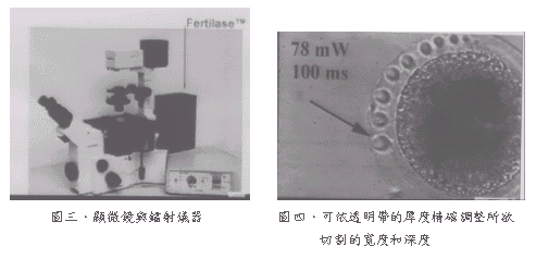 利用鐳射來作胚胎透明帶顯微切割則是目前最新與最有效的方法(如圖三)。鐳射具有精確,操作容易與不易傷害胚胎的特性(如圖四)。國外已有多篇研究報告證實其臨床的效果,此次首次引進國內,相信必會對所有不孕症患者帶來更多懷孕的機會。