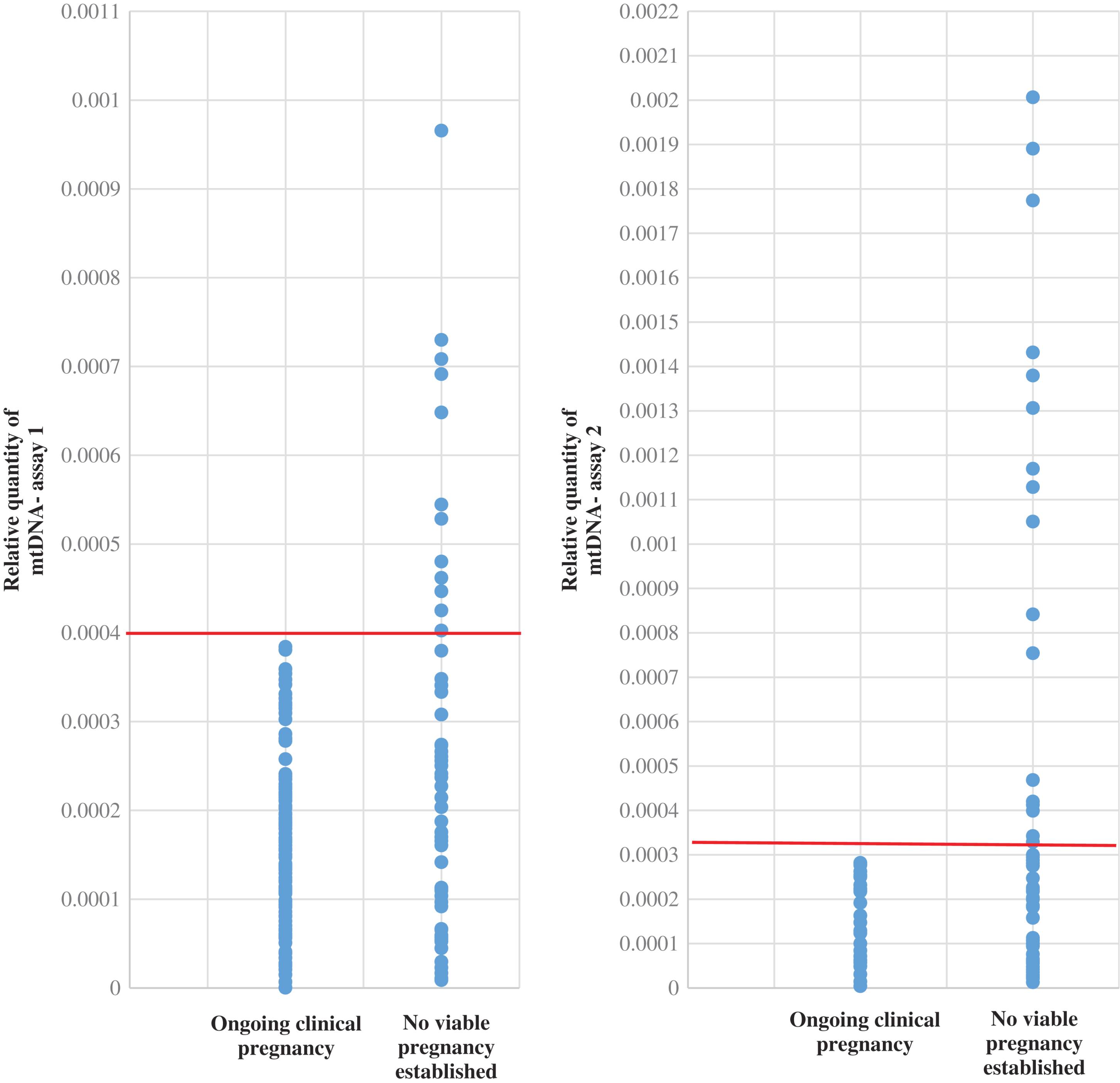 進一步再去研究粒線體DNA ( mtDNA ) 的量與臨床結果的相關連性。在表二(table2)中的結果顯示,持續懷孕率(ongoing preganacies),生化懷孕率(biochemical preganacies),自發性流產(spontaneous preganacies)所植入的染色體正常的胚胎皆顯示低量的粒線體DNA(low mtDNA levels),皆未顯示含有高含量的粒線體DNA (elevated mtDNA levels),但在著床失敗(Failure implantation)組別的胚胎中有84%為低含量粒線體DNA,但卻有16%的胚胎含有高含量的粒線體DNA。